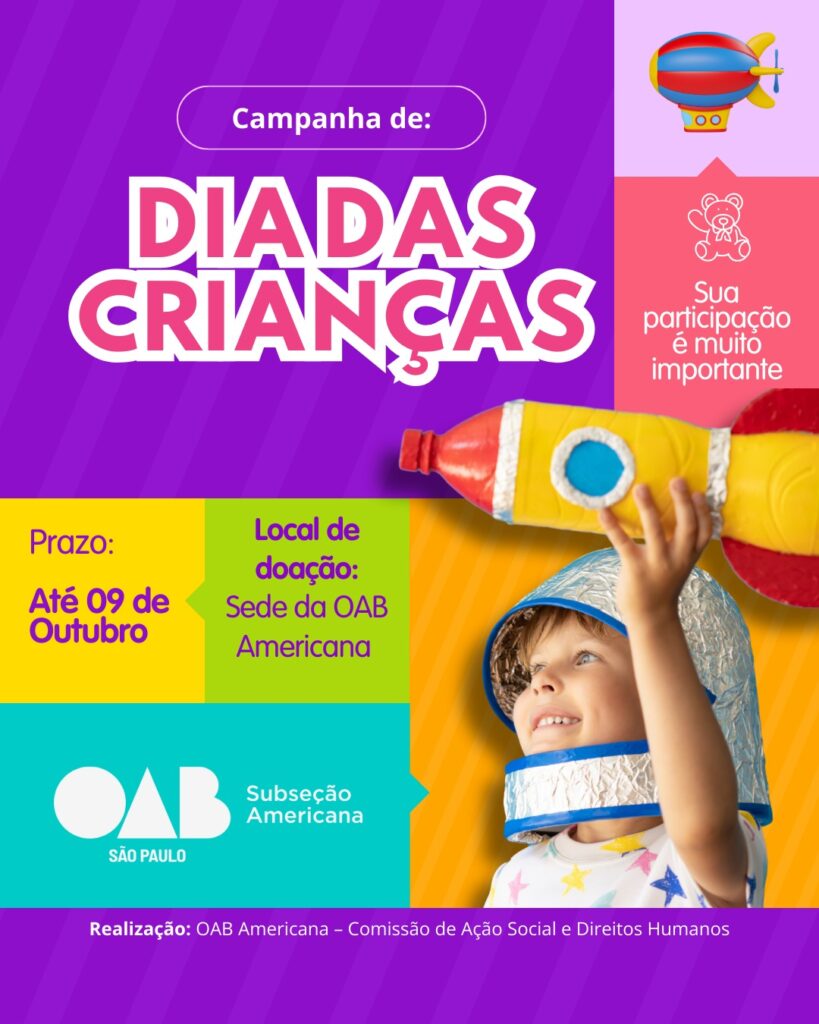 No mês das crianças, a diretoria da OAB subseção de Americana, por meio da Comissão de Ação Social e Direitos Humanos, convida as advogadas, os advogados e a sociedade americanense em geral, a participarem da CAMPANHA DO DIA DAS CRIANÇAS 2025. Faça parte dessa campanha, doando 1 bola ou uma boneca, ou ainda, um brinquedo usado, desde que em perfeito estado de conservação.