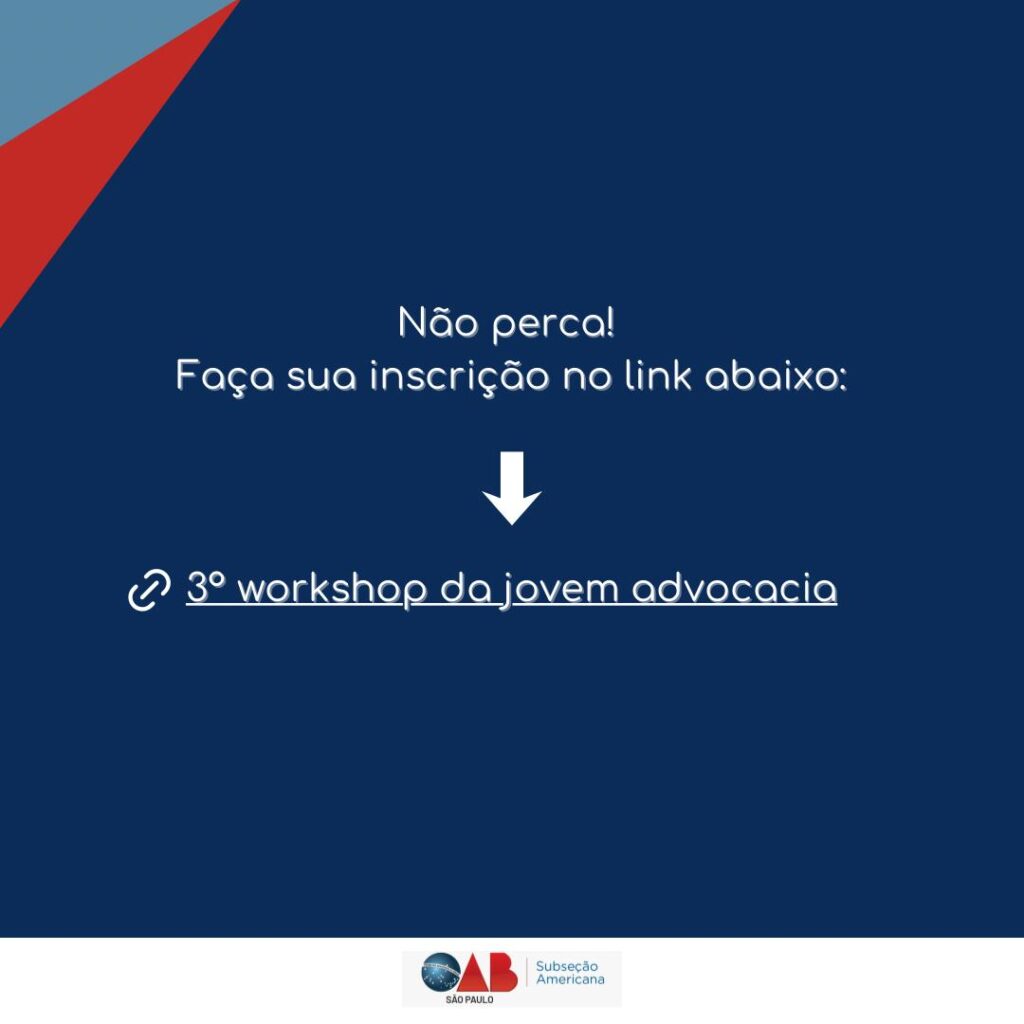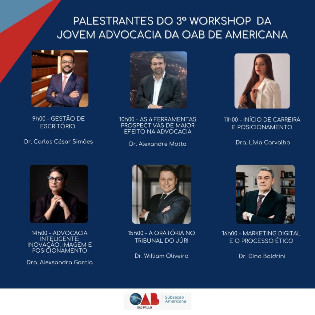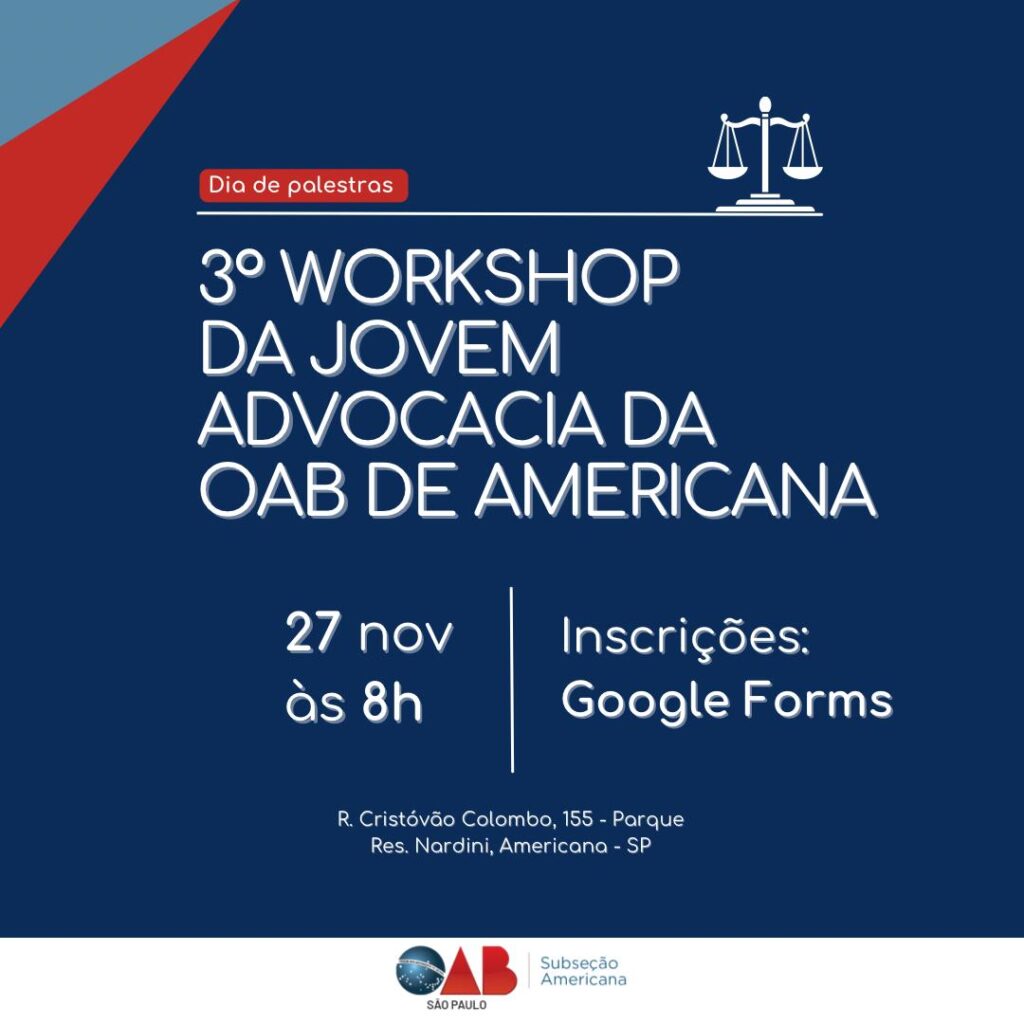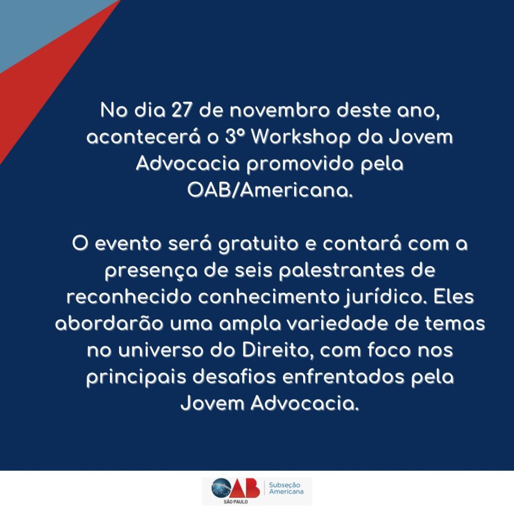 🚀 Vem aí o 3º Workshop da Jovem Advocacia, um evento imperdível da OAB Americana preparado especialmente para jovens advogados e estudantes de direito que buscam desenvolvimento, networking e posicionamento profissional!
